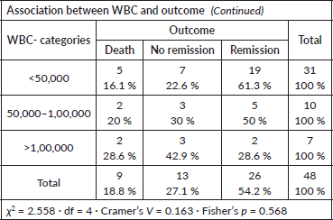 Conclusion: Demographic variables, nutritional status, WBC count and clinical presentations were not associated with induction outcomes, possibly due to the availability of extensive supportive care services such as accommodation near the hospital, free food and treatment and psychosocial support in the paediatric oncology unit. In contrast, ELN risk categories were strongly associated with outcomes.