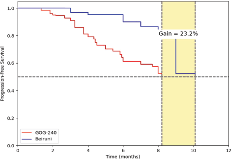 Figure 3. Median PFS in the Al-Beiruni cohort showed a 23.2% gain (1.9 months) compared to the GOG-240 curve. RMST analysis is required to confirm the reliability of this observed advantage.
