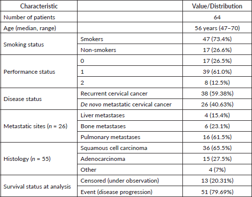 A total of 64 patients with metastatic or recurrent cervical cancer were included in the final analysis. All patients received first-line systemic therapy with a combination of bevacizumab, paclitaxel and either cisplatin or carboplatin. The analysis was conducted based on the ITT principle, meaning that all eligible patients who initiated treatment were included in the analysis regardless of treatment completion, adherence or follow-up status.