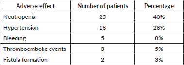 The Adverse events were monitored as part of routine clinical follow-up and documented based on available clinical records. The most frequently observed toxicity was neutropenia, occurring in 25 patients (40%), consistent with the known hematologic effects of platinum-based chemotherapy. Hypertension was the second most common adverse effect, reported in 18 patients (28%), followed by bleeding events in five patients (8%). Less frequent but clinically significant events included the occurrence of thromboembolic complications in three patients (5%) and fistula formation in two patients (3%), both of which are recognised risks associated with bevacizumab therapy. No unexpected toxicities were observed.