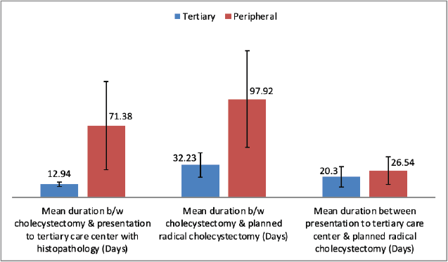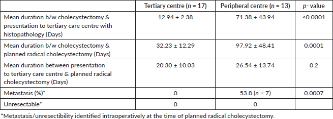 After presentation with histopathology findings of IGBC, patients treated at the tertiary care centre significantly shorter durations between cholecystectomy and planned radical cholecystectomy compared to those treated at the peripheral centre. However, after presentation with histopathology there was no significant delay between two groups between presentation at tertiary centre and planned staging laparoscopy followed by radical cholecystectomy. There was significantly higher metastasis observed in the peripheral centre group compared to tertiary centre group (Table 2). No patient had in hospital mortality following radical resection.