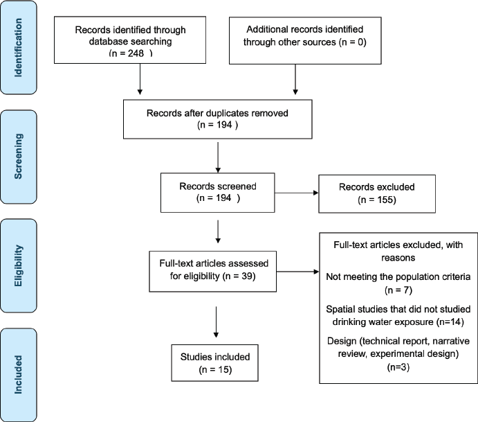 Custom searches were also conducted for specific contaminants (e.g., As, benzene and nitrates) and gray literature was retrieved through flexible queries in Google Scholar (e.g., ‘water contamination’ AND leukaemia AND children), applying manual filters for language (English/Spanish) and publication years (2001–2024).