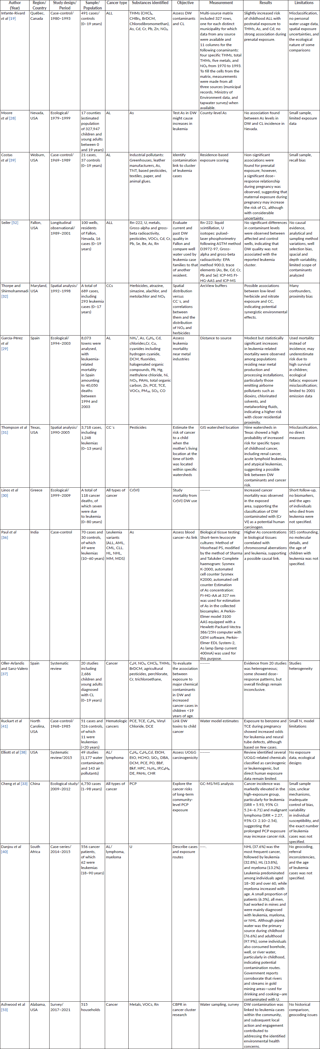 Several studies have highlighted the role of DW contaminants in the development of CL. Infante-Rivard et al [35] found an increased risk of ALL associated with exposure to trihalomethanes and metals like Cd and As in DW in Quebec, Canada. However, they acknowledged the challenges posed by measurement variability and exposure misclassification. Similarly, Moore et al [28] in Nevada found no significant association between As levels in DW and CL, suggesting that the relationship might not be as straightforward or might be influenced by other factors [28]. Costas et al [39] investigated potential associations in Woburn, USA, and found a non-significant link between contaminated water exposure during pregnancy and leukaemia diagnosis, although a significant dose-response relationship was observed for maternal exposure during pregnancy.