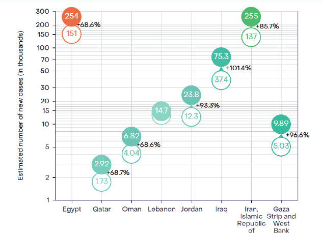 Figure 1. IARC Estimated number of new cases (in thousands) and projected percentage increase in incidence Eastern Mediterranean countries from 2022 to 2040 [3].