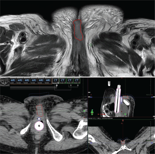 A key step was a detailed clinical exam to determine the extent of disease and the feasibility of placing interstitial catheters at a safe distance from the urethra. A planning CT (2.5 mm slices) was fused with a diagnostic MRI to precisely delineate the gross tumour volume (GTV) (Figure 1).