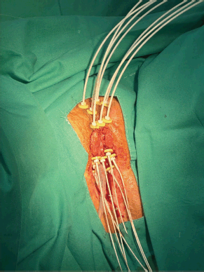 Figure 2. Case 1. The vulvar tumour and the implantation of seven interstitial catheters are observed.