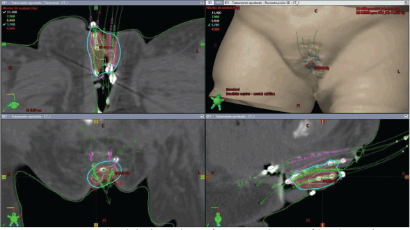 Figure 3. Case 1. 3D treatment plan calculated on simulation CT for fraction #1. The position of the catheters and the dosimetric distribution in the axial, coronal and sagittal planes are observed, in addition to a 3D reconstruction. In light blue, the isodose of 5.7 Gy; in white, the isodose of 11.4 Gy.