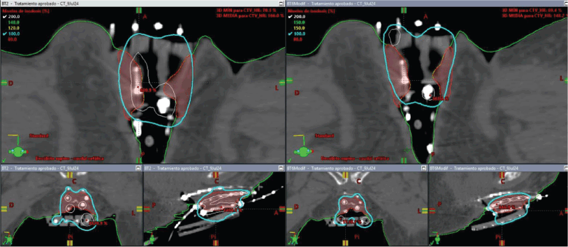 Figure 4. Case 1. 3D treatment plan with bolus. The position of the catheters and the dosimetric distribution in the axial, coronal and sagittal planes are observed. On the left, fraction #2 to #5. On the right, fraction #6 to #8. In light blue, the isodose of 5.7 Gy; in white, the isodose of 11.4 Gy.