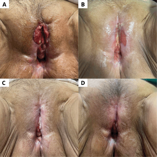 Figure 5. Case 1. (a): Vulvar tumour prior to treatment. (b): 6 weeks later. (c): 3 months later. (d): 6 months later.