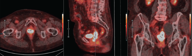 Figure 6. Case 2. PET-CT scan prior to BT. Axial, sagittal and coronal section. A hypermetabolic tumour mass in the vaginal vault and a left pelvic lymphocele were observed.