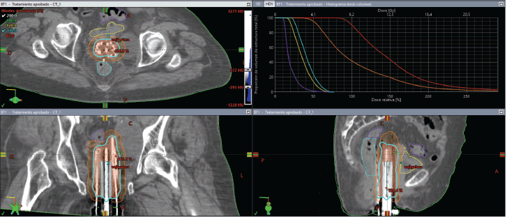 Figure 7. Case 2. Dose-volume histogram and dosimetric distribution of fraction #1 in axial, coronal and sagittal planes. It is shown in red CTV-HR, in orange CTV-IR, in light blue the rectum, in yellow the bladder and in purple the sigmoid colon.