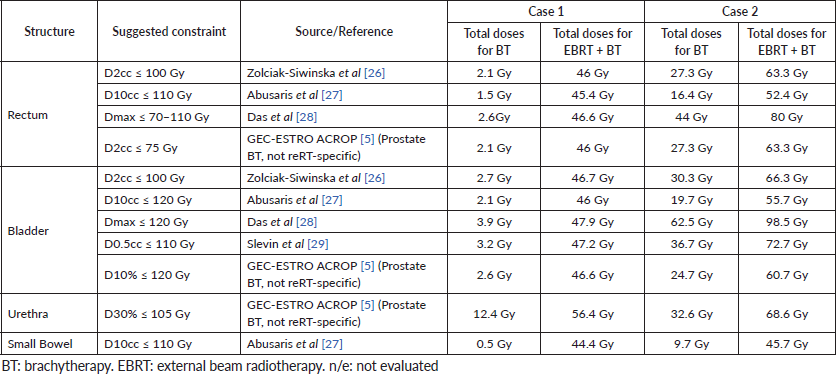 Table 1. Proposed OAR dose constraints in pelvic reirradiation. Dosimetric data from both clinical cases are shown. All doses are shown in EQD2, α/β = 3.