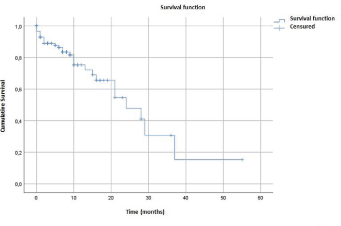 Data were entered and analysed using SPSS version 25 and Excel 2019. Central tendency parameters (mean, mode, median) and dispersion (standard deviation) were used to describe continuous variables. Categorical variables were described using percentages. The comparison of qualitative variables was done using the chi-squared test. The Kaplan-Meier method was used to estimate average survival times, and the survival curves were compared using the Log-rank test. Prognostic factors were determined using a Cox model. A p-value of <0.05 was considered statistically significant.