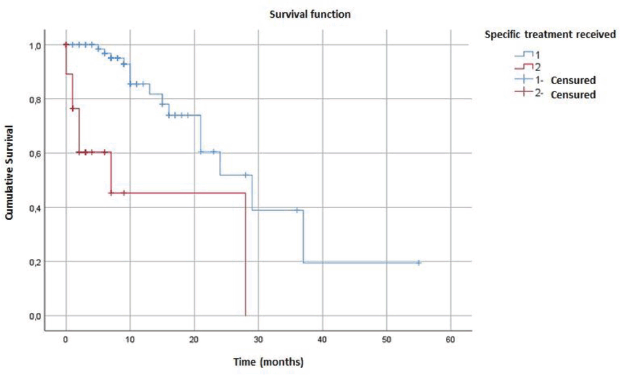 The median overall survival in our cohort was estimated at 24 months (95% CI = 14.21–33.78) (Figure 1). Survival was better in patients who received specific treatment (29 months) compared to those who did not (7 months) (p < 0.001) (Figure 2).