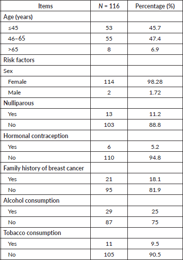 Methodology: We conducted a cross-sectional, descriptive study with retrospective data collection from 116 patients with dnMBC followed in two cancer reference hospitals in Yaoundé, Cameroon, between 2020 and 2022. Data were analysed using SPSS version 25 and Excel 2019.