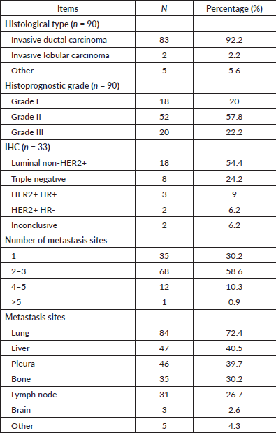 The diagnosis was cytological in 26 (22.4%) patients and histological in the other 90. When histological examination was performed, the most frequent histological type was invasive ductal carcinoma (92.2%). More than half of the patients were classified as SBR II (57.8%).