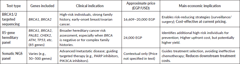 Table 2. Types of genetic testing and indicative prices in Egypt.