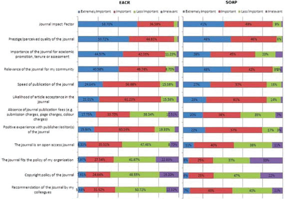 Over 30% regarded the policy fit of the journal with the researcher’s organization, journal copyright policy and personal recommendation of the journal as important factors, with ‘irrelevant’ ratings never exceeding 25%.
