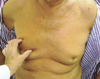 Unlike its incidence in women, who have a bimodal age–frequency distribution, its incidence in men is unimodal, with a peak incidence at 71 years. It has a central, sub-areolar location, and nearly 85% of cases show up in a physical exam. The most common histological type is invasive (infiltrating) ductal carcinoma with an incidence of 85–90% [68].