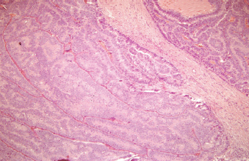 Figure 4. Haematoxylin-Eosin stain (20x). B12-2166: LB—invasive multifocal ductal carcinoma of intermediate-grade malignancy (NGII, BRII), with papillary and cribriform features, measuring 23 x 20 x 15 cm.