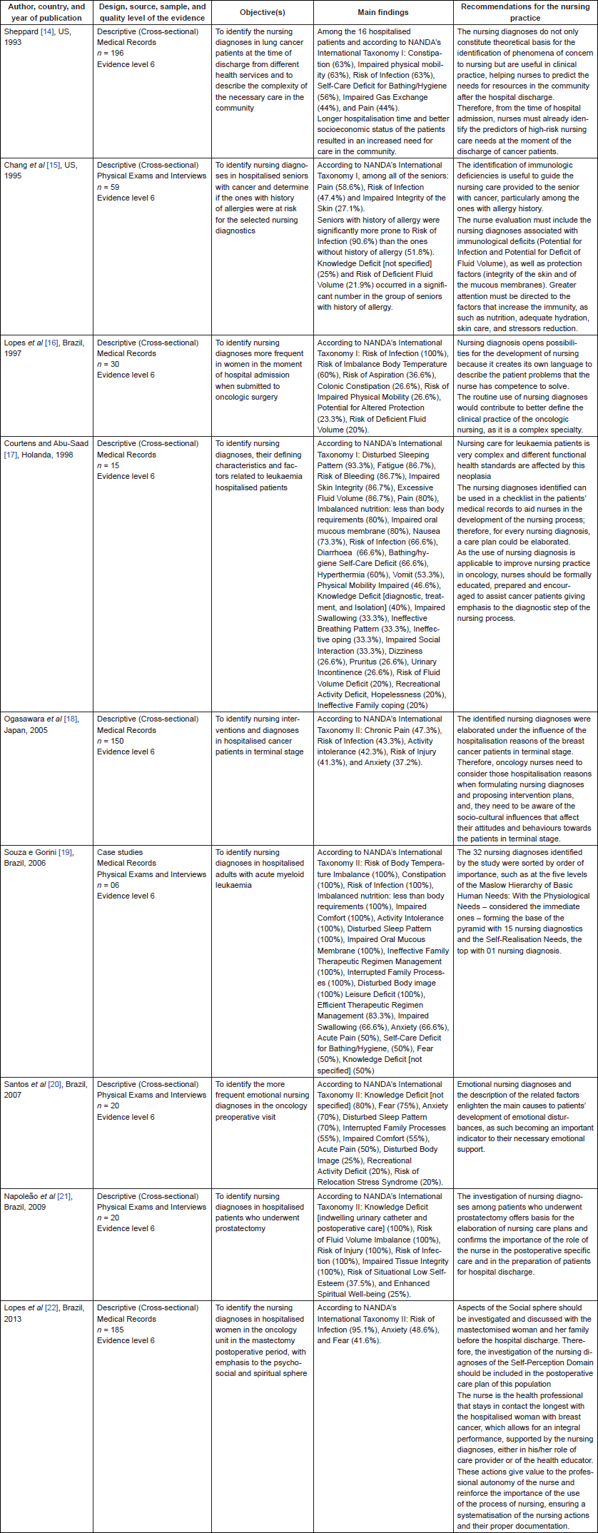 Therefore, if the need for publications that address NDs in the daily practice of oncology nursing is considered, considering the scarcity of publications on the subject, the results of this review provide a more general mapping of common NDs in adults/elderly people hospitalised with cancer, thus contributing to improve the nursing process in hospital oncology services.