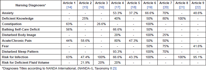 As for the source of research data, five articles used medical records, three articles used interviews and physical exams, and only one used all of the above-mentioned sources. Regarding the NANDA International [3] Taxonomies, four articles, published until 1998, used Taxonomy I, and five articles, published since 2005, used Taxonomy II. Three articles did not directly publish the value of the relative frequency of the NDs in the studied population, which was calculated using the absolute numbers of NDs and participants.