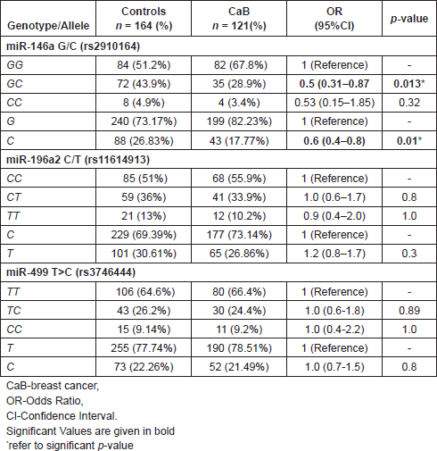 Table 3. Association of miR-146a G/C (rs2910164), miR-196a2 C/T (rs11614913) and miR-499 T>C (rs3746444) polymorphisms with CaB verses controls.
