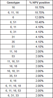 High-risk HPV types 16 and 18 are by far the most predominant types at all the anatomical locations reported; however, epidemiological data reveal that the role of HPVs in the etiology of head and neck cancers is rather controversial. The reported frequency of HPV DNA in laryngeal site studies often varies between 3% and 85% in the literature. Works performed by Venuti et al (2000) have reported HPV-6 DNA positive cases although in low copy numbers [19], Veitía et al (2009) also reported HPV-6 infection in patients with HNSCC by PCR [14]. Major et al (2005) showed that based on the prevalence, physical state, genotypes, and copy number of HPV DNA, cancers and papilloma tend to show a different HPV DNA profile [20]. Our results are comparable with those in the literature, since we found that in the infection with a unique genotype, HPV-16 was the most frequent with 18.70%, just as the mixed infection with genotypes HPV 6, 11,16 (18.70%), was followed by genotype HPV-6 (low risk) in 12%, HPV-31 and 51 (high risk) with 4.10% respectively (Table 1).