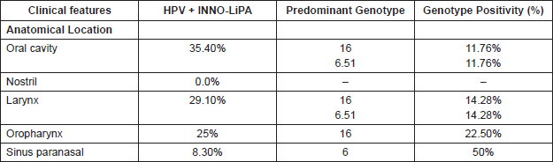 In relation to the anatomical location, the oral cavity is the localisation with greater HPV positivity (35.40%) followed by the larynx with 29.10%; the genotypes 6, 16, and 51 being the most common in both locations; we also found that 22.5% of the oropharynx cases are high-risk HPV-16 positive, type predominant, and a 8.30% HPV positivity in the paranasal sinus. These data allow us to suggest that HPV could be an important risk factor in oral, laryngeal, and oropharyngeal cancer.