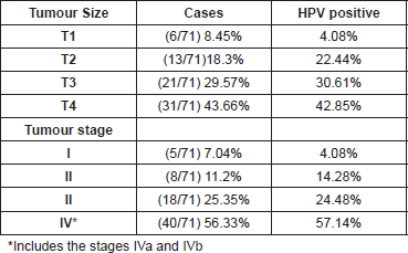 Table 3. HPV-positive cases according to the size and stage of the tumour.