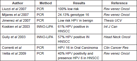 As we said before, in Venezuela there are very few studies that include the features considered in this work, one investigation was made by Liuzzi et al (2007), which included the evaluation of 29 samples with HNSCC. HPV infection was detected by PCR in 34.48%, of these the majority were low-risk HPV infection [32]. On the other hand, Mijares et al (2007) found the HPV genotype 16 in 24.13% of the samples from oral cancer evaluated during their work [33]; while Jimenez et al (1998) showed that in premalignant lesions from the oral cavity, the HPV genotypes predominant were 6, 11, 31, 16, and 32, and they said that these are mostly male and presented in the second and fourth decade of life [34]. These differences in the genotypes found can be explained by the method employed in the HPV detection, and the sample employed in each study (Table 4).