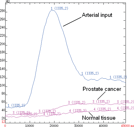 Figure 1. A time-attenuation curve for PCa and normal tissue. A density–time curve obtained by placing an ROI over the selected arterial input of external iliac artery, neoplastic tissue and healty prostate tissue plotting density (expressed in Hounsfield units (HU)) on the Y-axis and time (expressed in milliseconds) on the X-axis.