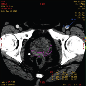 Figure 2. Region of interest (ROI) in prostate CT perfusion: the manually drawn ROI containing malignant tissue (purple contour on the right side of prostate gland) and healthy tissue (purple contour on the left side of prostate gland).