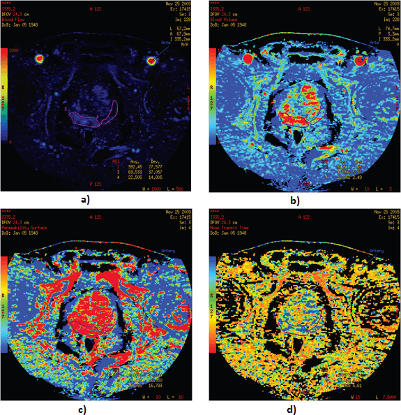 Figure 3. Functional maps of blood flow: (a) blood volume, (b) permeability surface, (c) mean transit time, (d) for PCa and normal tissue. Visualisation of functional maps of PCT parameters, with a focus on regions of interest is presented.