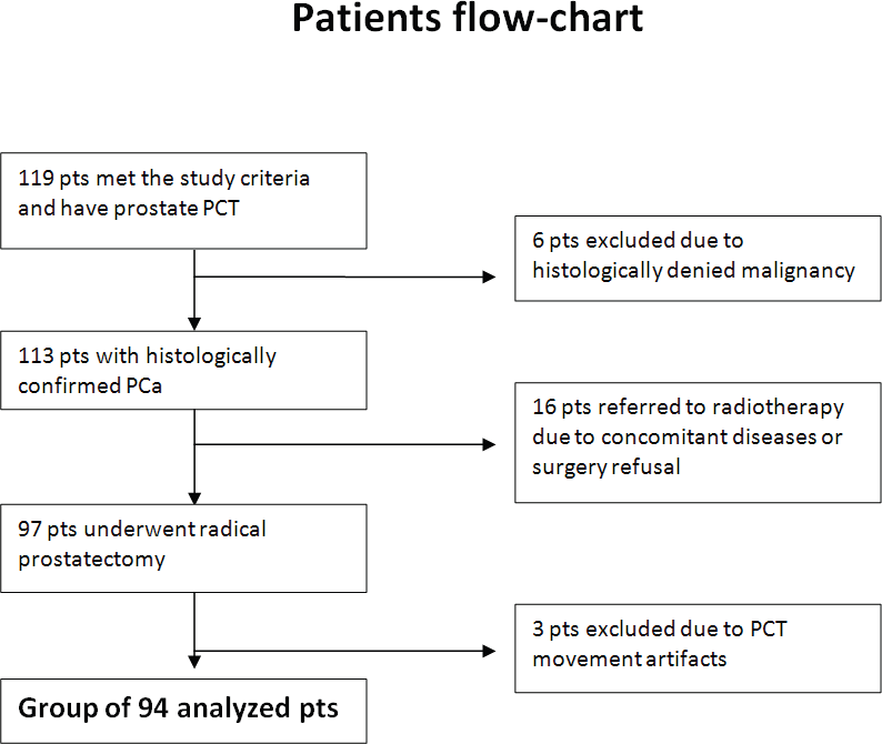 Between 2007 and 2011, abdominal and pelvic CT and prostate gland perfusion CT were performed in 127 patients who were eligible for the study protocol and signed informed consent. A total of 94 patients with PCa (median age: 63 years; range: 49–77) met the selection criteria and were enrolled in the study 1 in the years 2007–2011 (Figure 4). The characteristics of the study population are shown in Table 1.