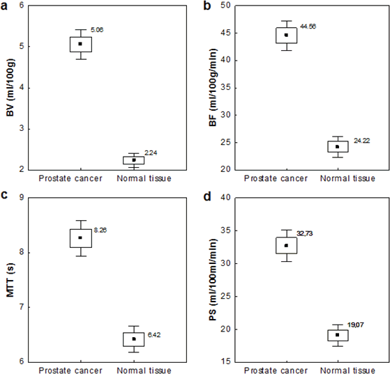 Figure 5. Differences in perfusion parameters between PCa and normal prostate tissue. The values of CT perfusion parameters. (a) blood volume, (b) blood flow, (c) mean transit time, (d) permeability-surface in malignant and healthy tissue. ■ Mean value, £ Mean ± SE, I Mean ± 1,96*SE.