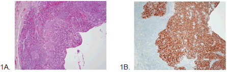A 55-year-old male with a limited history of smoking (fewer than ten packs per year) and no history of excessive alcohol consumption presented in March of 2000 with a left level II neck mass as well as a mass at the base of the tongue. Biopsies of the neck nodal mass (Figure 1A) and the base-of-tongue mass revealed non-keratinizing type SCC on haematoxylin and eosin (H&E) stain (x200), a distinct morphologic type that characterizes HPV-related OPSCC [8]. An immunohistochemistry stain (IHC) for p16, a known surrogate marker of HPV [8], was positive (Figure 1B). The patient underwent primary resection of the oropharynx mass and left neck dissection. The pathologic stage of the cancer was T1N2aM0 (IVA). Postoperative adjuvant radiation therapy (7200 cGy) was administered. Surveillance radiologic imaging and clinical examinations continued through 2006, at which time a CT scan of the chest, abdomen, and pelvis did not reveal recurrent cancer.