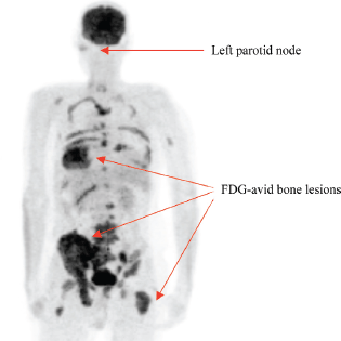 Figure 2. FDG-PET from 2011 showing multiple FDG avid osseous metastatic lesions.