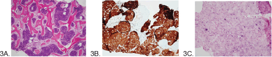 In August 2011, the patient presented with bone pain in the back, pelvis, and legs. Blood work revealed an elevated alkaline phosphatase. Bone and CT scans revealed findings consistent with metastatic osseous lesions, which were confirmed on a fluorodeoxyglucose (FDG)-PET/CT scan (Figure 2). A bone marrow biopsy revealed non-keratinizing SCC on H&E stain (Figure 3A) that was morphologically similar to the OPSCC from 2000 and that was positive for p16 by IHC (Figure 3B) and for HPV by in situ hybridization (ISH) for high-risk HPV (Figure 3C). Fibre-optic endoscopy from the nasopharynx to the hypopharynx failed to reveal new oral mucosal lesions. Bronchoscopy and oesophagoscopy were not performed. Anal-rectal examination failed to reveal an anal mass. Palliative chemotherapy was initiated with paclitaxel (135 mg/m2) every 3 weeks and continued for 14 cycles through October 2012 with stable disease. A treatment break was then initiated due to symptomatic peripheral neuropathy. Disease progression documented in February 2013 prompted treatment with Cetuximab.