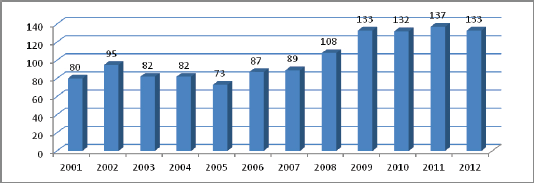 Figure 2. Graduates of medicine studies at universities in Lithuania (2001–2012), per million population.