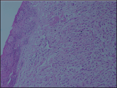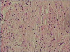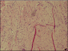 Figure 1. Tumour cells infiltrating myometrium in single-file linear or Indian file pattern (H & E × 100).