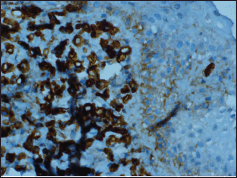 Following this, a biopsy from the scar over the left breast was taken that showed ILC positive for cytokeratin and gross cystic disease fluid protein (GCDFP) and negative for E cadherin (Figure 2, 3). Oestrogen receptor (ER) and progesterone receptor (PR) were diffuse to weak positive and HER-2 negative. Postoperative CT chest abdomen and pelvis showed no metastasis. Bone scan was normal. She was started on palliative chemo with 5-fluorouracil, epirubicin, cyclophosphamide following which hormone therapy was planned.
