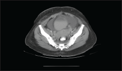 Further investigation with CT abdomen and pelvis showed moderate to gross ascites with irregular soft tissue stranding in the omentum. Bilateral irregular soft tissue density mass lesions noted in adnexa, on the right measuring 42 × 33 mm and on the left measuring 43 × 21 mm. (Figure 4). Para-aortic nodal mass seen as heterogenous conglomerate soft tissue attenuation. The stomach showed diffuse irregular wall thickening.