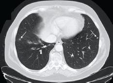 Figure 1. Patient #1. Thoracic CT scan documenting micronodules in the right and left lungs (lower lobes). Arrows indicate secondary lesions.