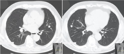 Figure 3. Thoracic CT scan (patient #3) exhibiting bilateral nodes. Arrow indicates lesion in the left lung (apical segment of the lower lobe) and right lung (anterior segment of the lower lobe).