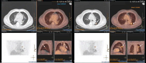 Figure 4. Patient #3 PET-CT-FDG: two hypermetabolic nodes in the lower lobe of the left lung – apical and anterobasal segments (arrows).