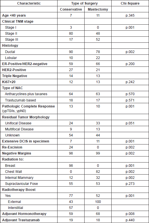 Table 1 describes the distribution of patient and tumour characteristics of the study population. The median age of the patients treated with BCS was 49 ± 11, while 50 ± 10 of patients treated with mastectomy (p = 0.19). There was no difference between the distribution of patients younger than 40 years, 7% and 11% from breast-conservative surgery group and mastectomy group, respectively (p = 0.345).