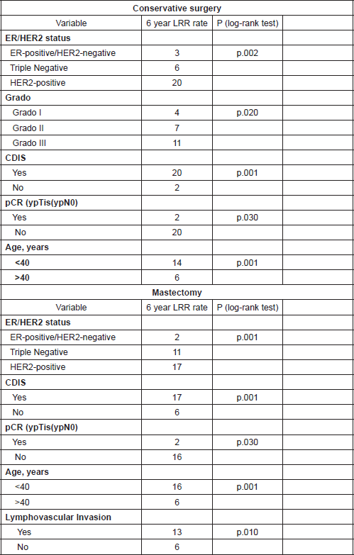 By univariate analysis, variables associated with an increased LRR were for BCS: HER2 positive, grade III, DCIS, No-pCR (ypTis, ypN0), and age < 40 years and for mastectomy: HER2 positive, DCIS, No-pCR, and LVI.