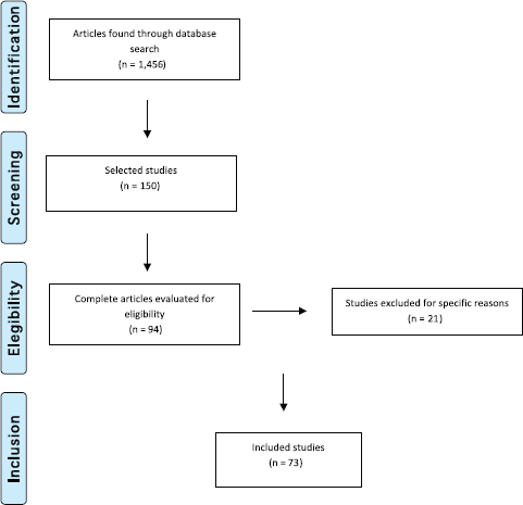 We then conducted a second selection after reading the titles and abstracts. This selection left 150 references of which 94 remained for the following round. We then read the full text of the 94 studies and 21 of those were excluded for not meeting the established criteria. Thus, 73 studies made up the final selection as illustrated in the flowchart following the PRISMA model [27] shown in Figure 2.