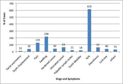 Figure 3. Signs and symptoms in head and neck region. Others = poor alveolar scarring, mandibular fracture, periodontal pocket, exposed bone, fistulas, bleeding, and macroglossia. N/A = not available.